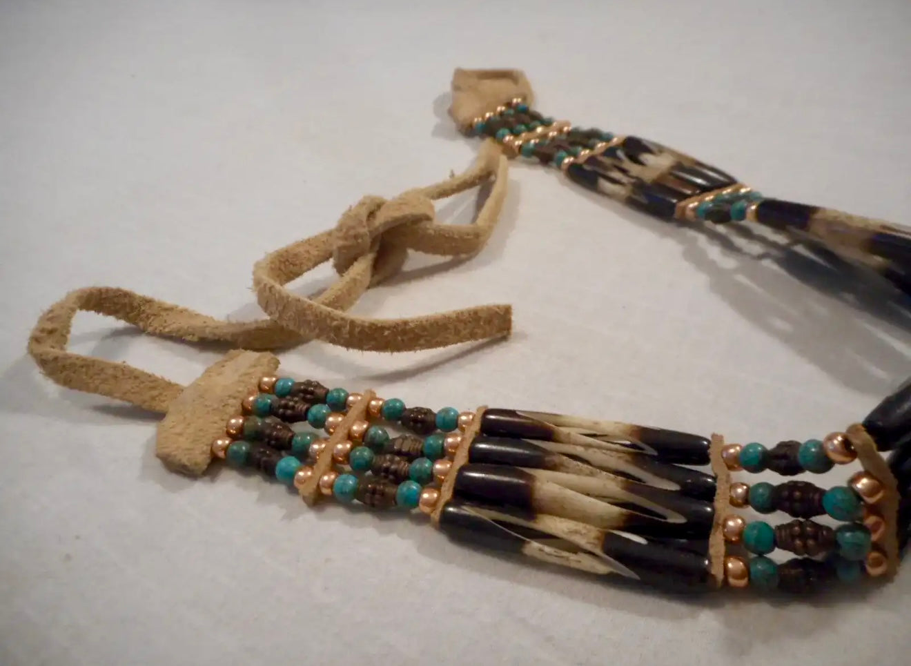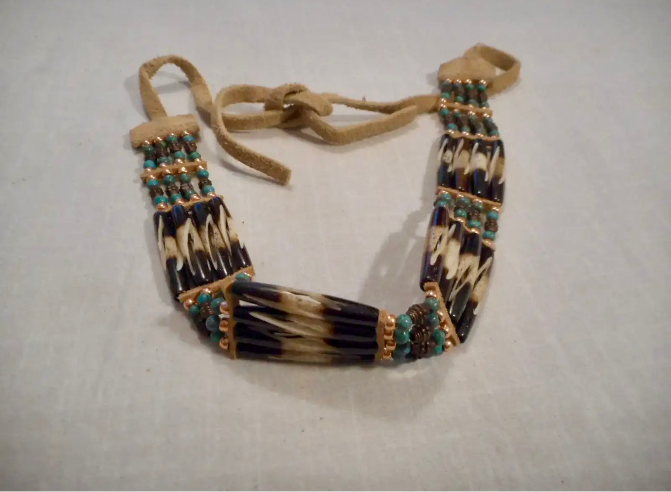 This is a vintage hand made beaded hat band. The bead work is 13" long x 1" tall. The leather straps are 10 1/2" long.