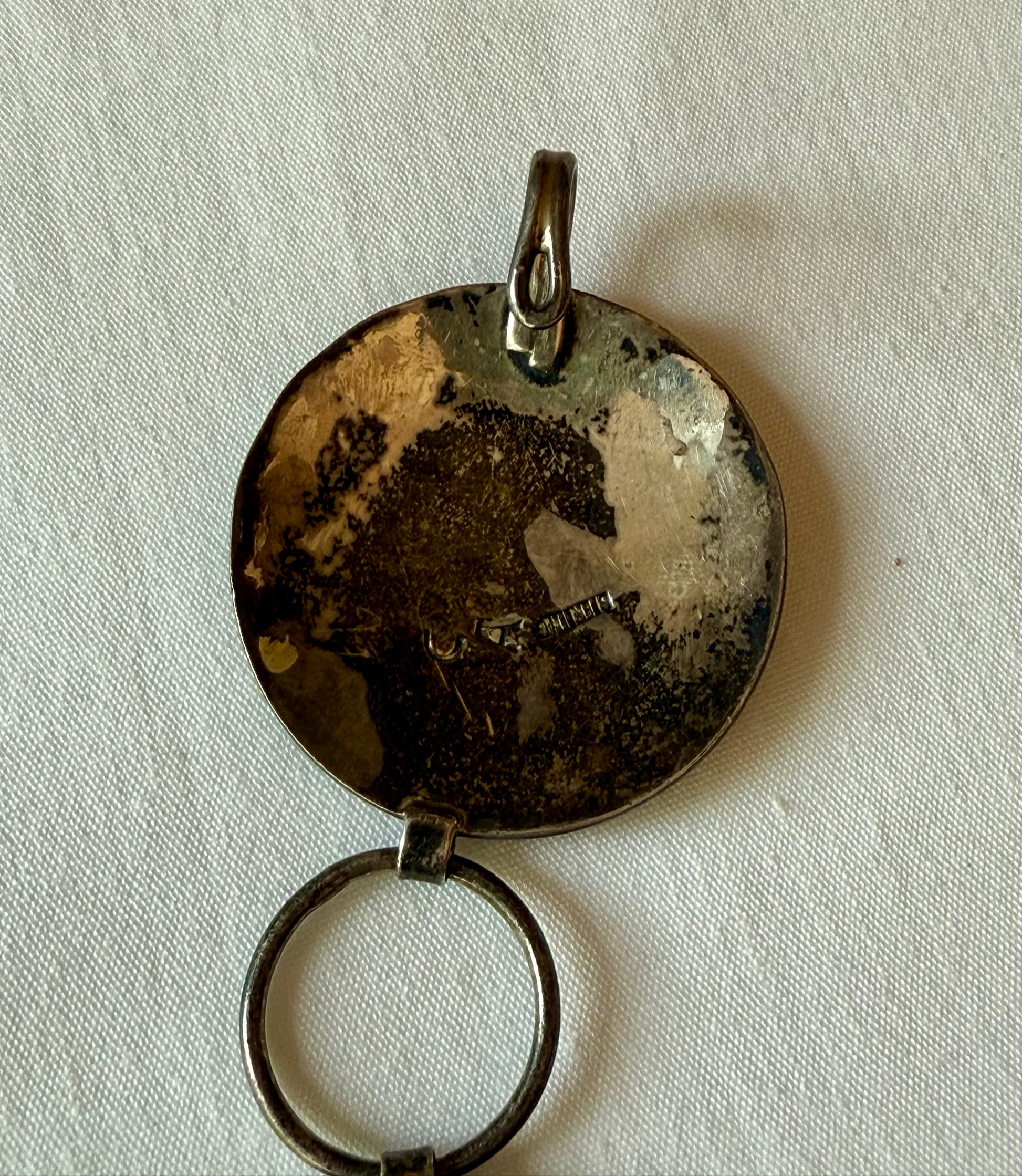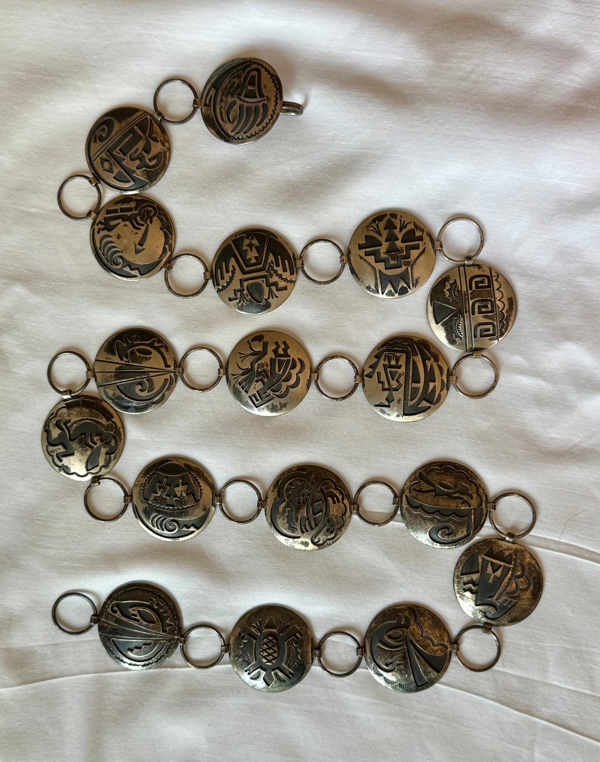 This striking Hopi-style Concho belt by master silversmith Cecil Ashley embodies traditional craftsmanship and timeless artistry. Each concho is hand-stamped with bold, geometric motifs inspired by Hopi symbolism, reflecting balance, harmony, and connection to the natural world. The sterling silver pieces are finely detailed, showcasing Ashley’s hallmark precision and artistry, while the deep patina enhances the intricate designs. It measures 40 1/4”.