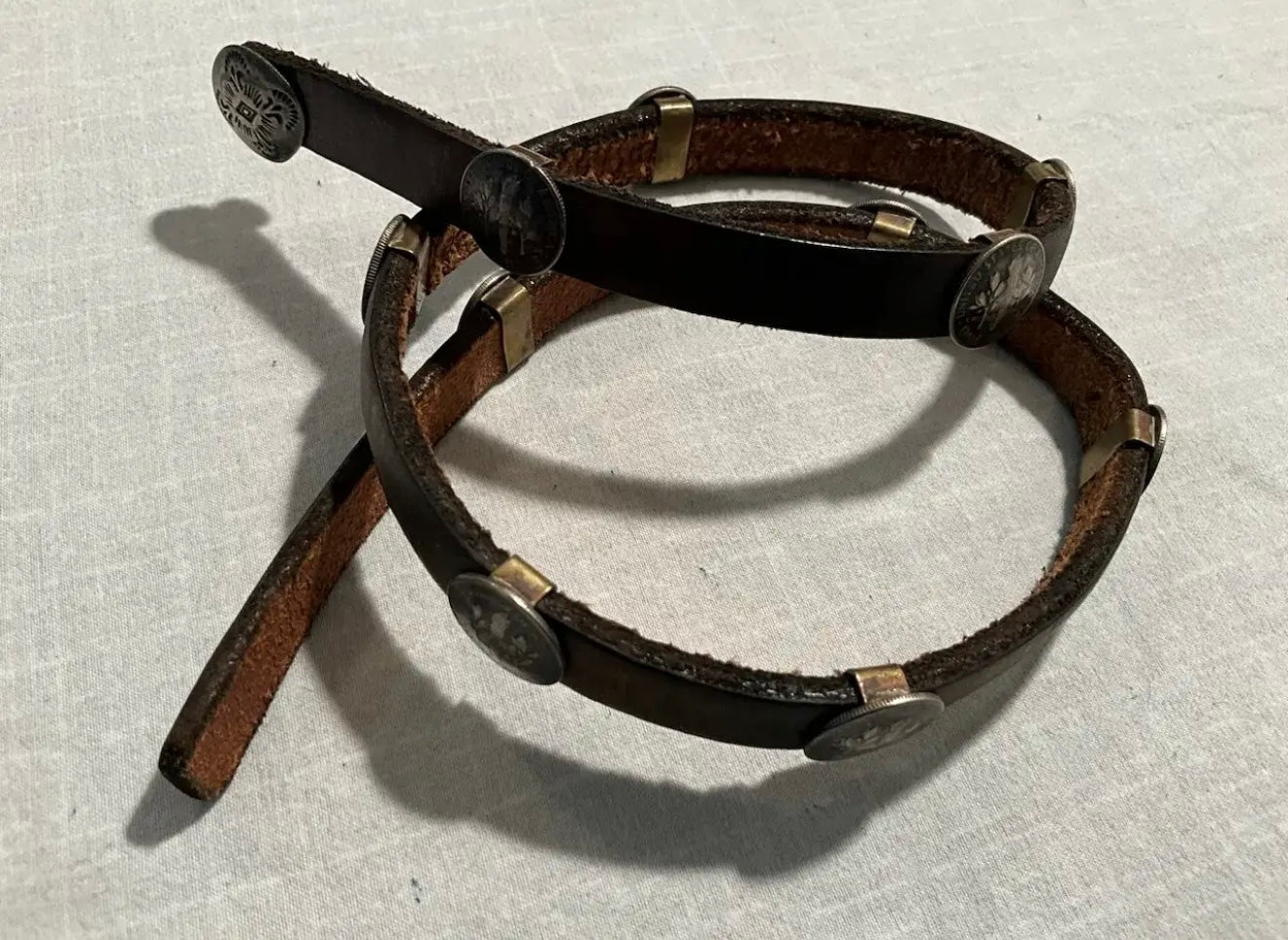 This is a vintage mercury dime coin, silver hat band. There are 10 mercury dimes measuring 11/16 inch diameter. The buckle measures 1 inch by three-quarter inch. The band measures 27 1/2” long.