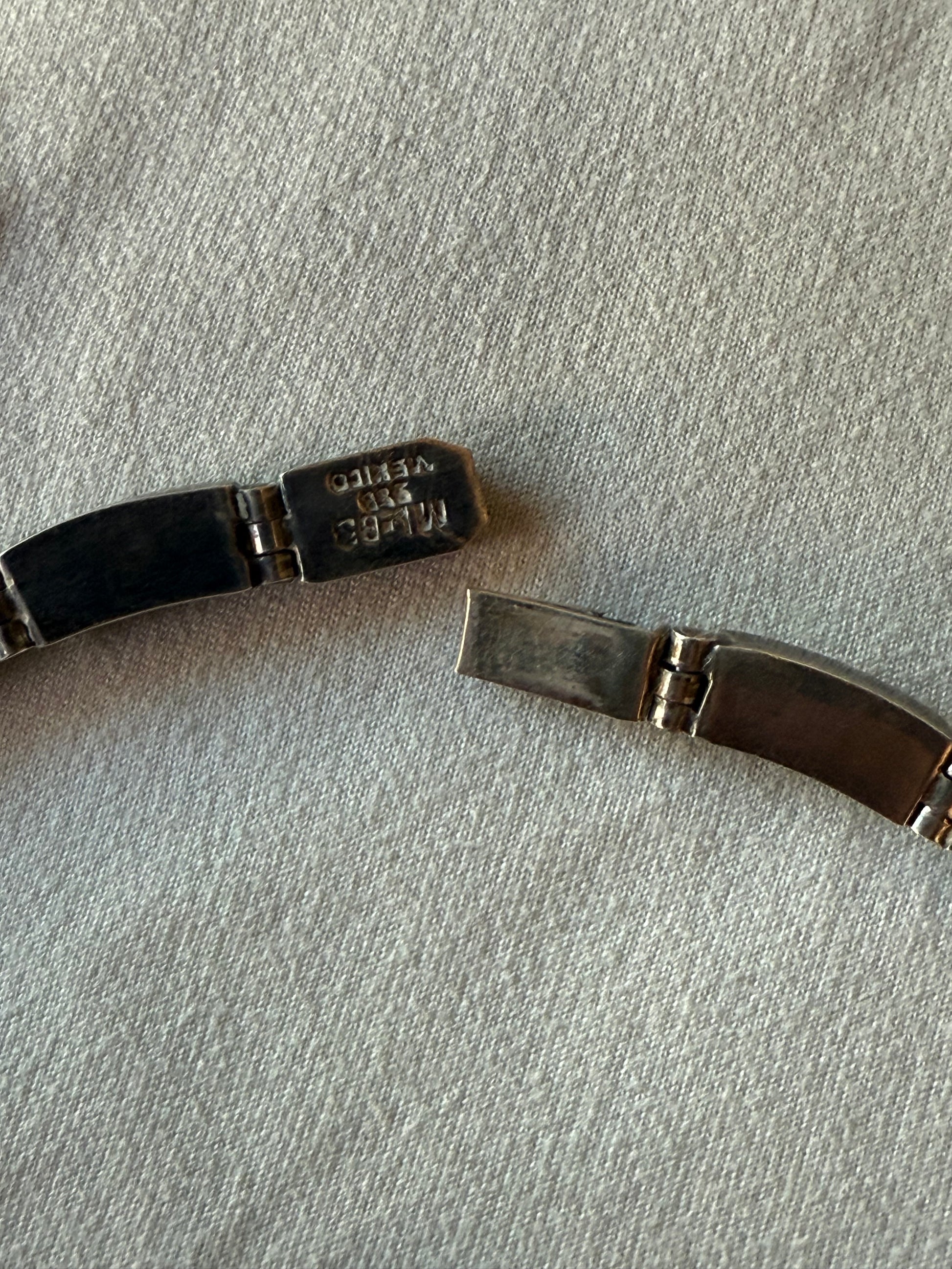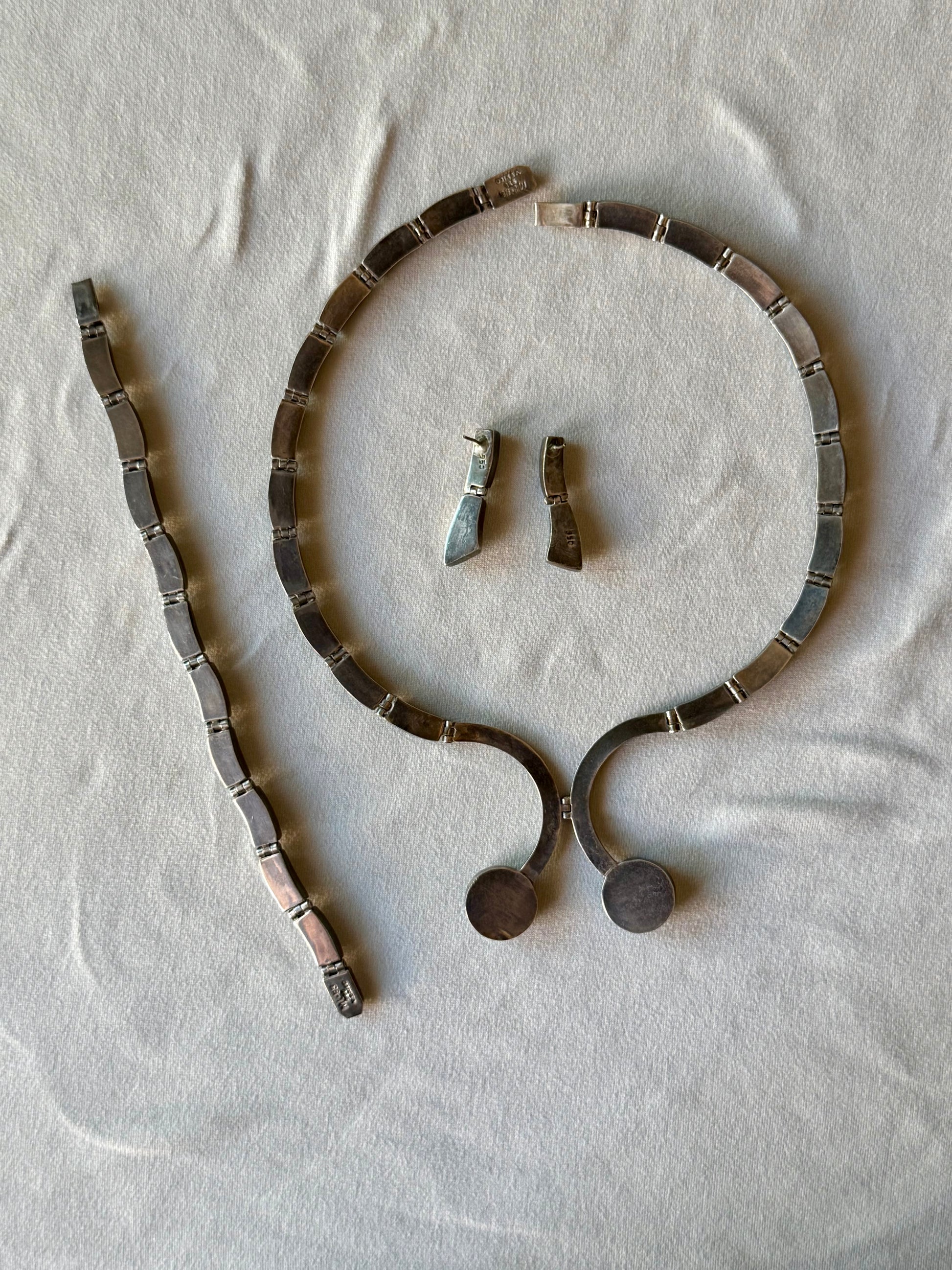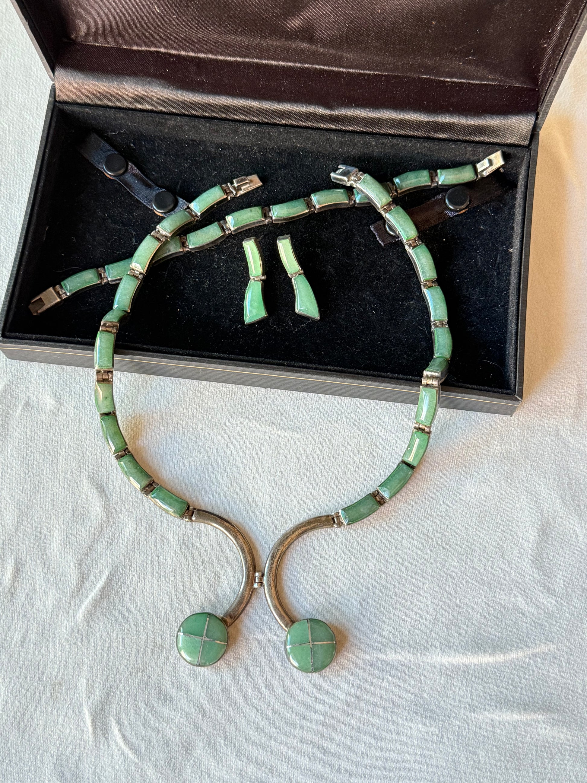 This is such a beautiful set! The necklace, bracelet and earrings are Mexican Jade and Sterling. This set is Taxco. The jade pieces are 5/8” x 1/4”, the circles on the necklace are 3/4” in diameter. The necklace is about 17.5”, the bracelet is 7 5/8” long and 1/4” wide, and the earring are 1 1/4” long with a slightly bigger piece of jade on one end.