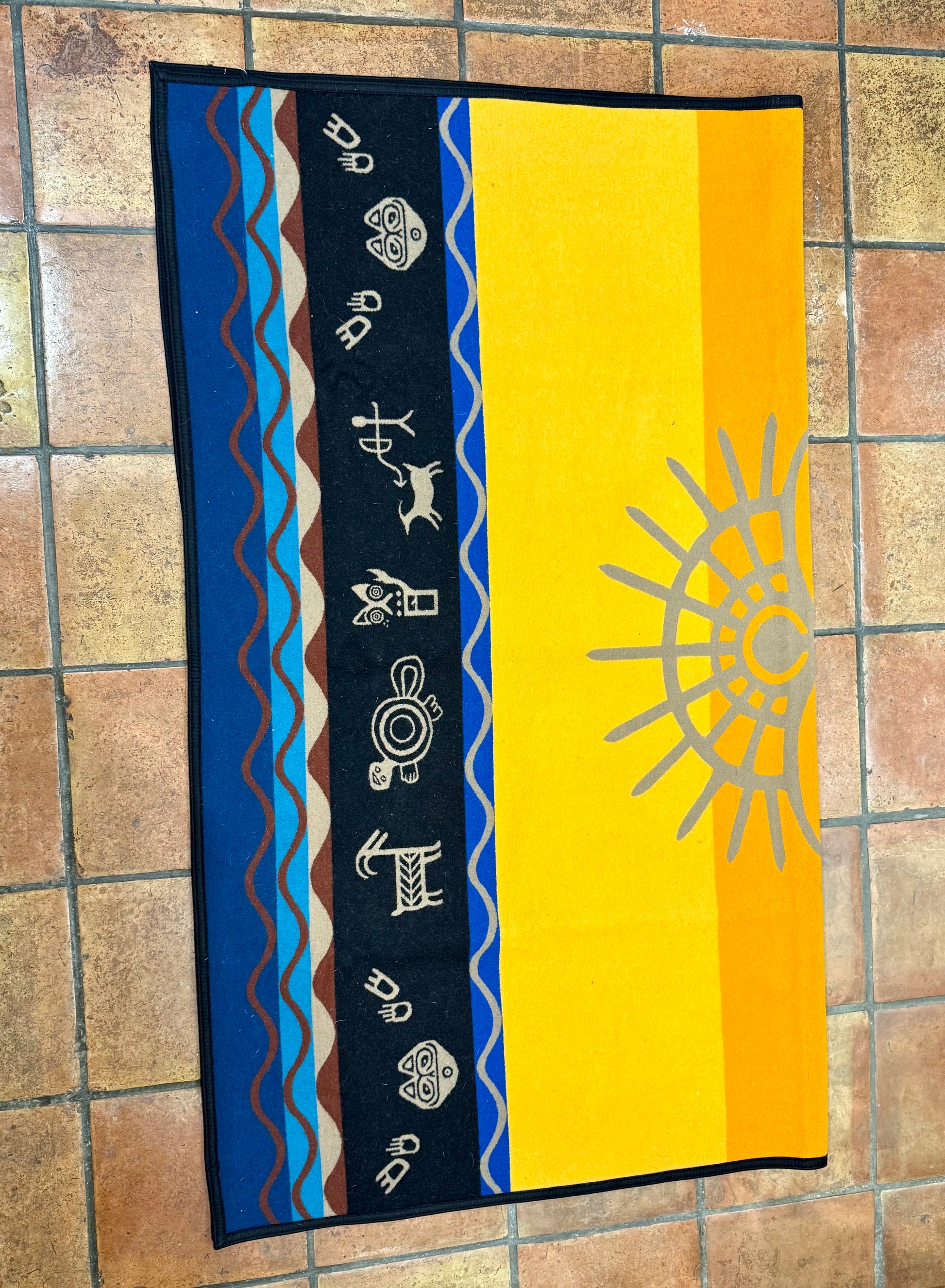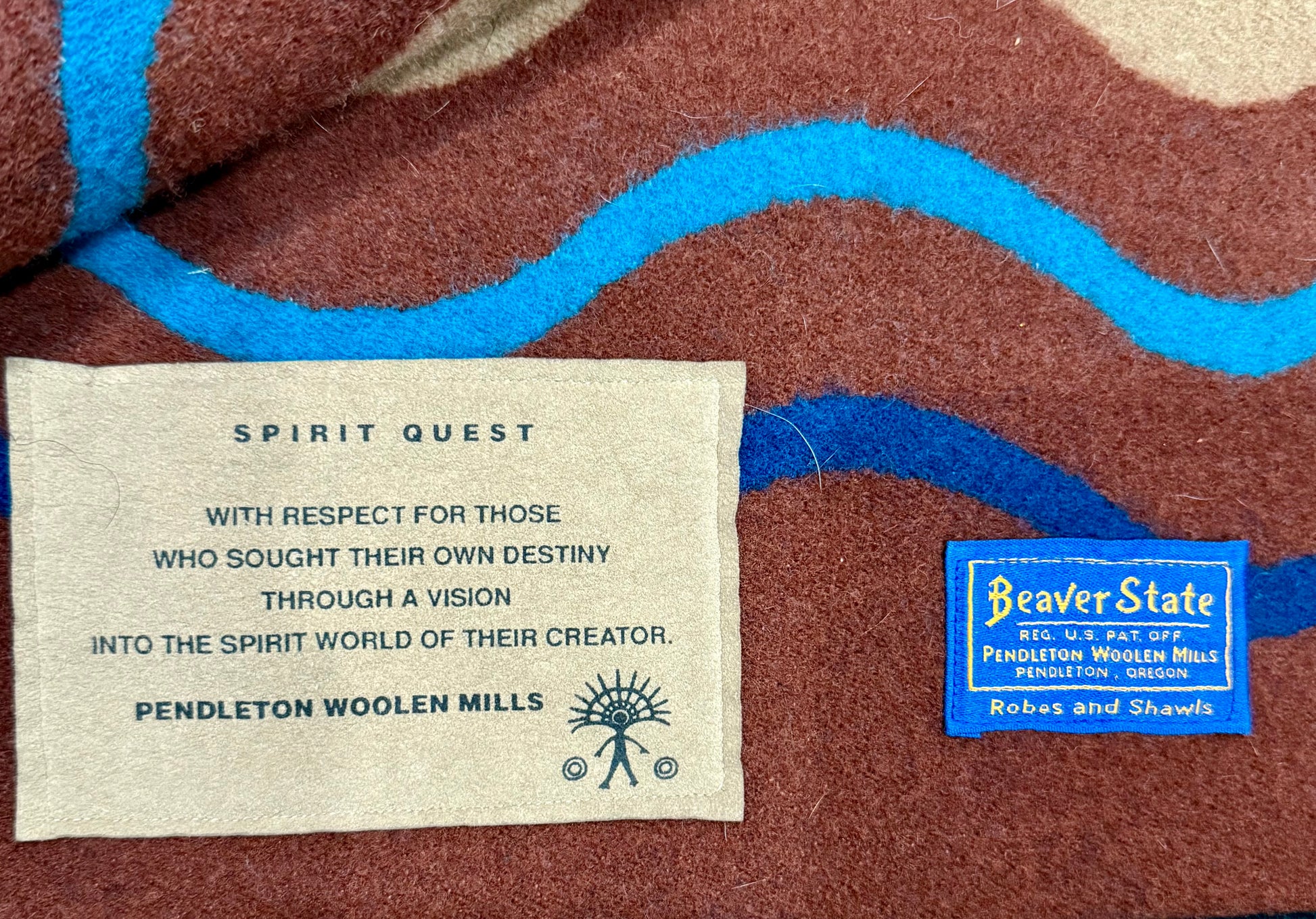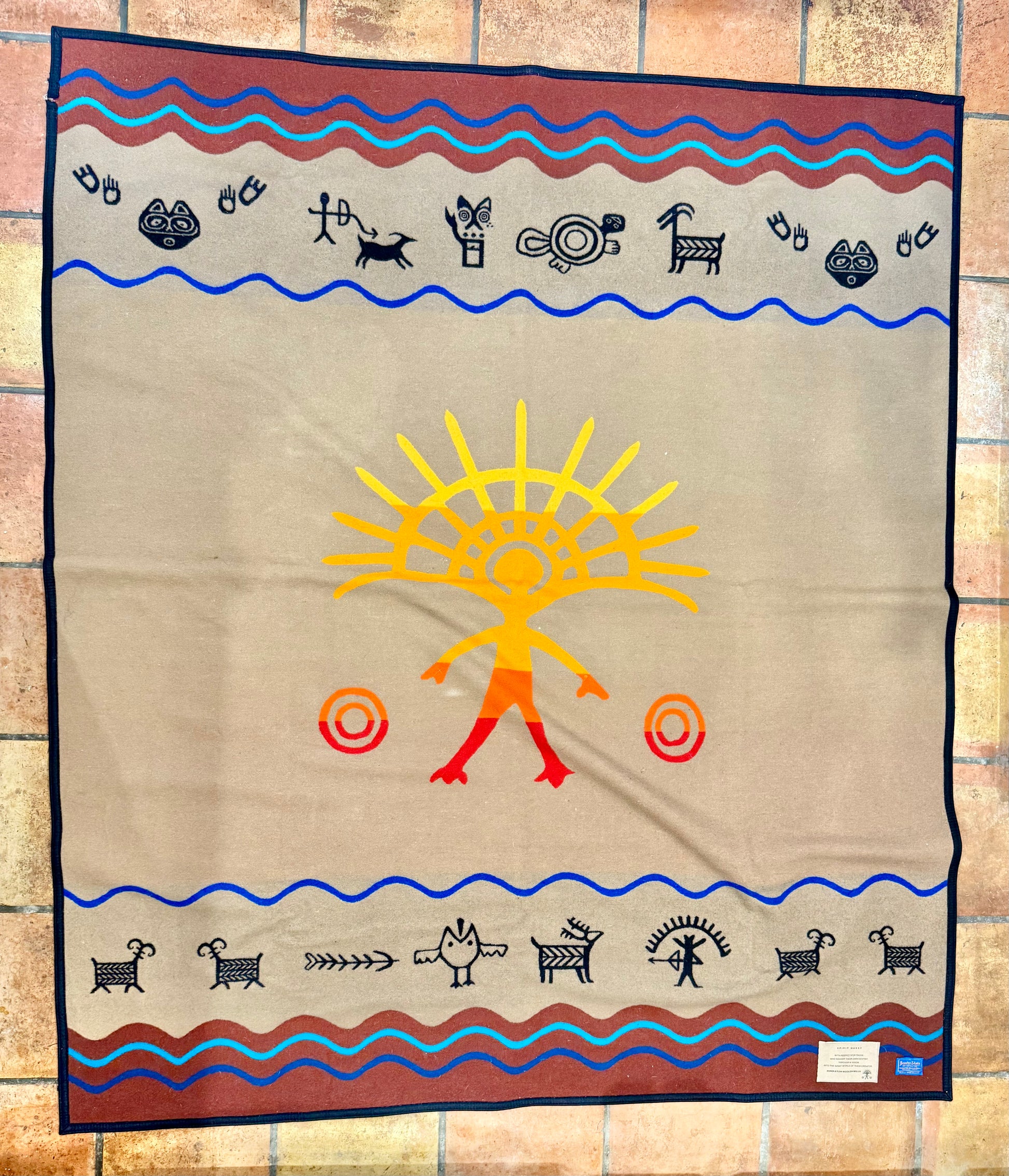 A vibrant Pendleton Beaver State blanket featuring the powerful “Spirit Quest” design, with a radiant central figure, pictograph-style motifs, and desert-inspired colors. A collectible piece that blends heritage, artistry, and bold style for display or everyday use. Highly collectible, “Spirit Quest” is admired for its powerful design, vibrant color palette, and connection to Pendleton’s legacy of weaving that honors Native-inspired traditions.