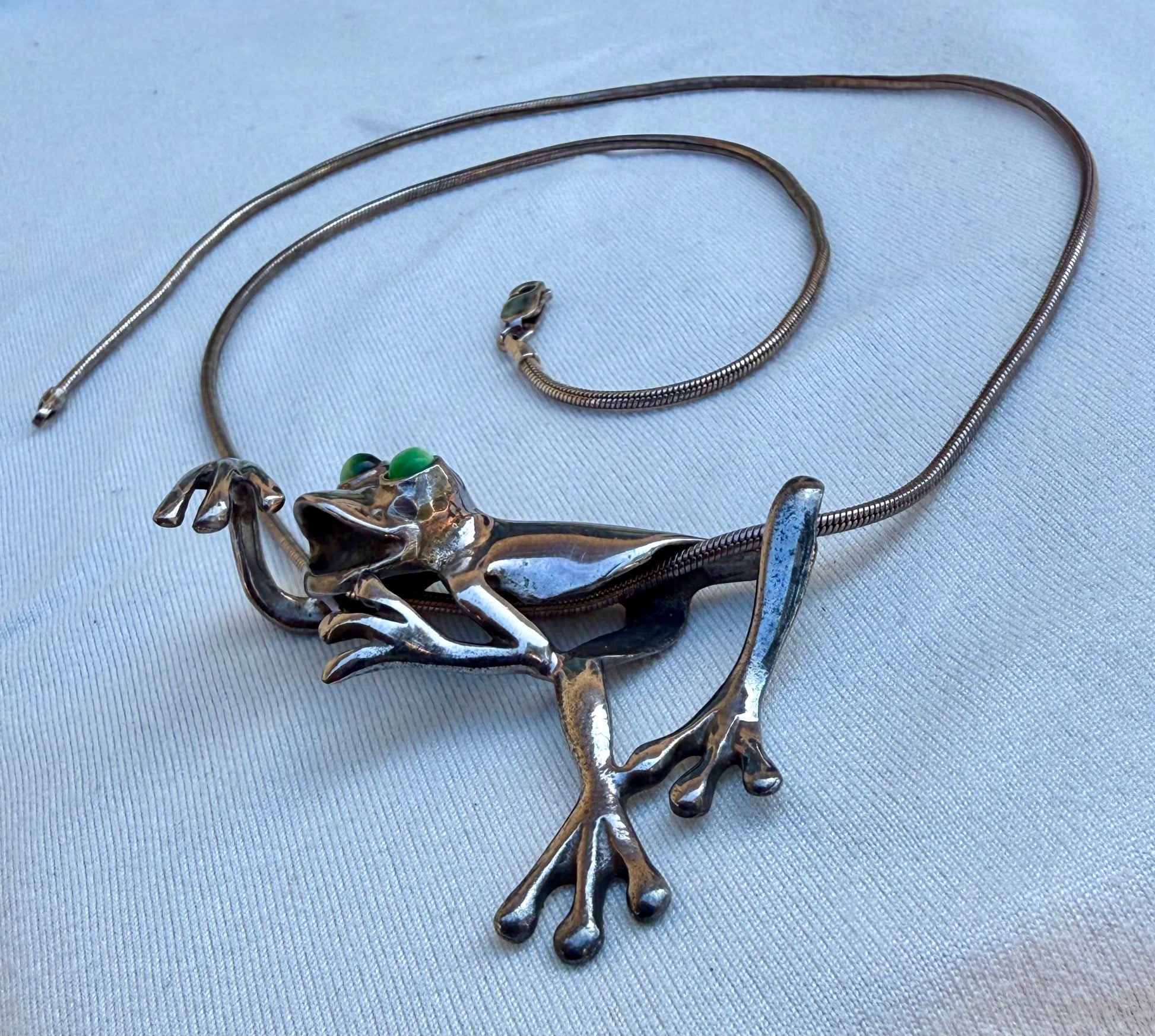 This adorable vintage sterling silver frog necklace is sure to add a playful touch to any outfit. With its vibrant green eyes and detailed 2" frog pendant, it's the perfect accessory for any animal lover. The 20" chain length makes it a versatile and eye-catching piece.