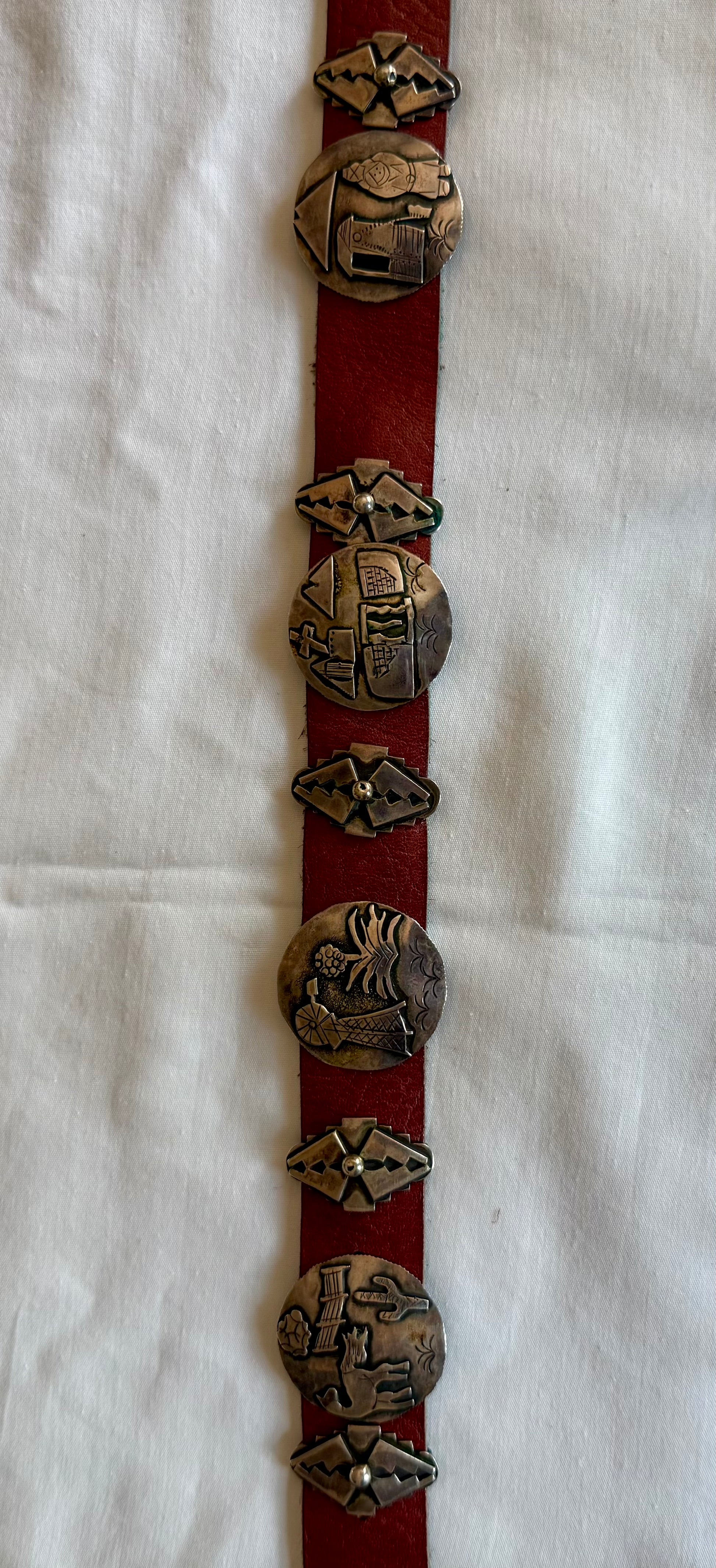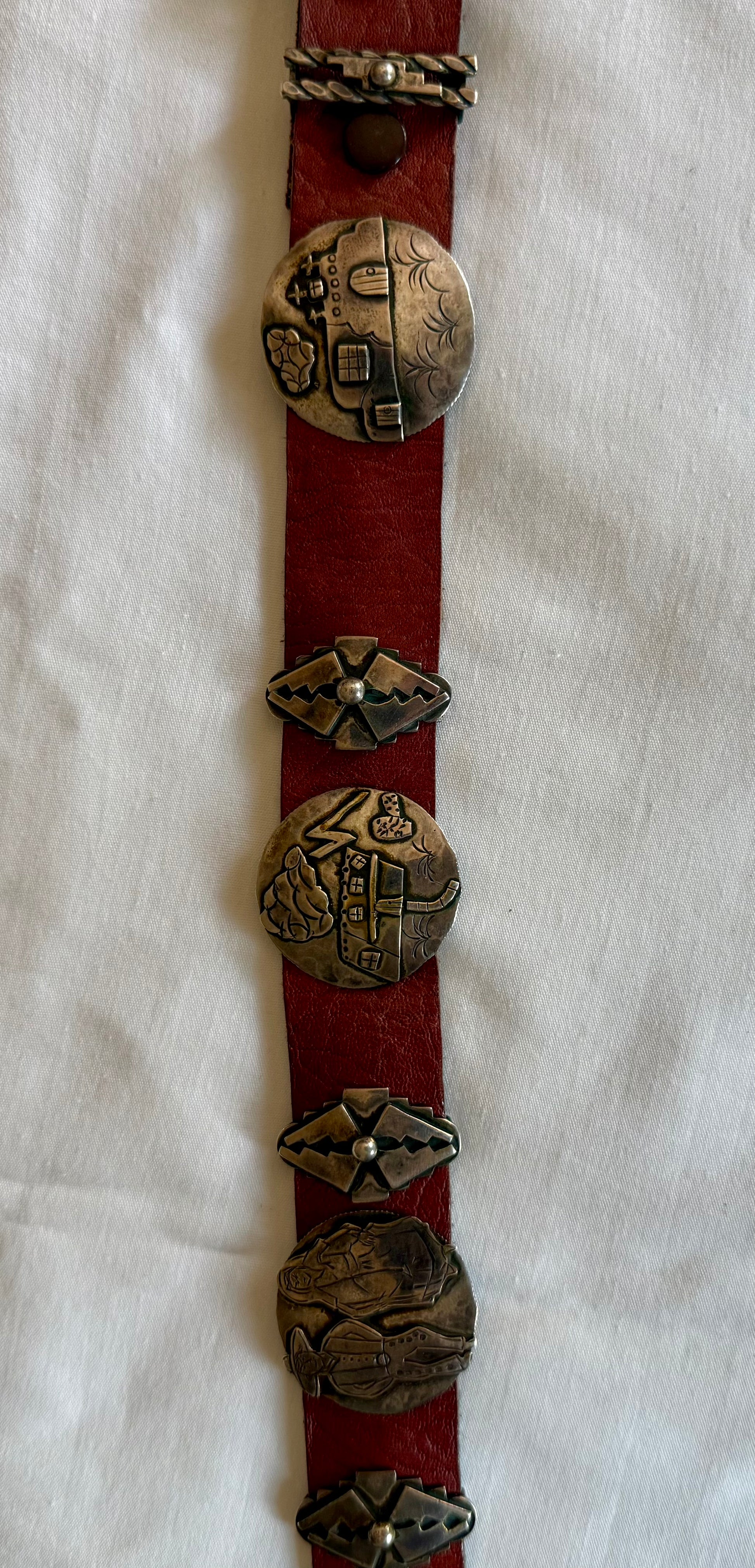 This is a vintage unique storyteller Concho belt. There are 11 picture Conchos that measure 1 1/2 inch diameter. There are 11 small Conchos, which measure 1 1/4 inch by 3/4 inch. The buckle measures 2 and 3/4 inch by 2 inch. The two belts keepers measure 1 1/4 inch x 1/4 inch. The sterling pieces weigh a total of 237.5 grams not including the leather belt. Each of the sterling pieces are marked with the artist’s name.