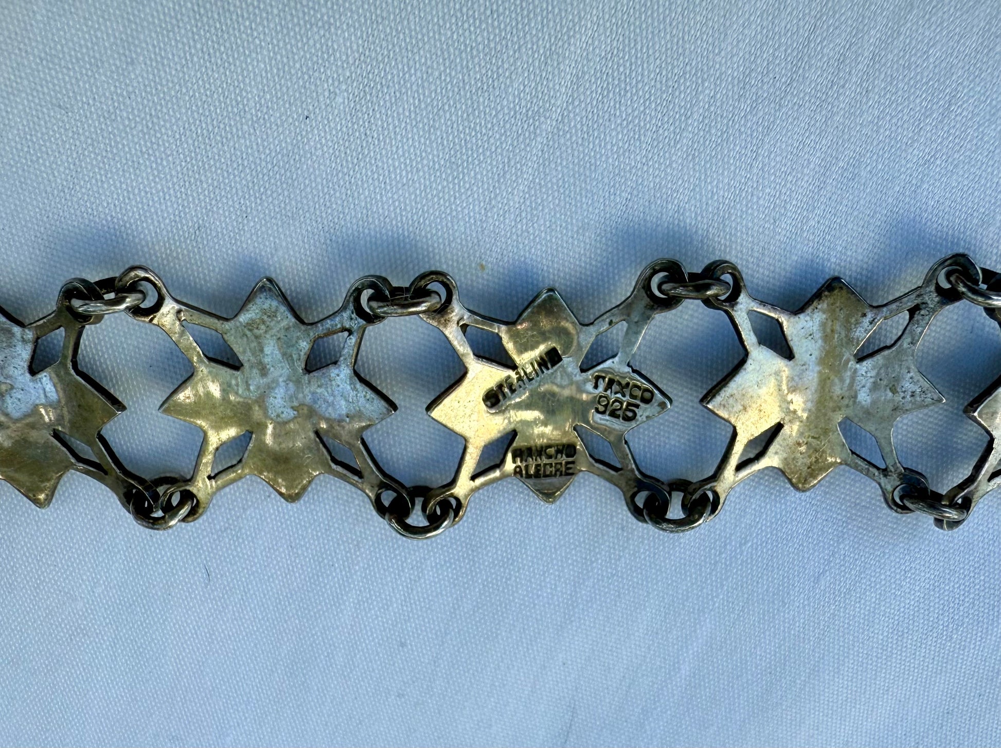 Expertly crafted in Taxco, Mexico, this vintage sterling silver bracelet measures 7 3/4". With its intricate design and high-quality material, it adds a touch of elegance to any outfit. Perfect for collectors or those looking for a timeless piece of jewelry.