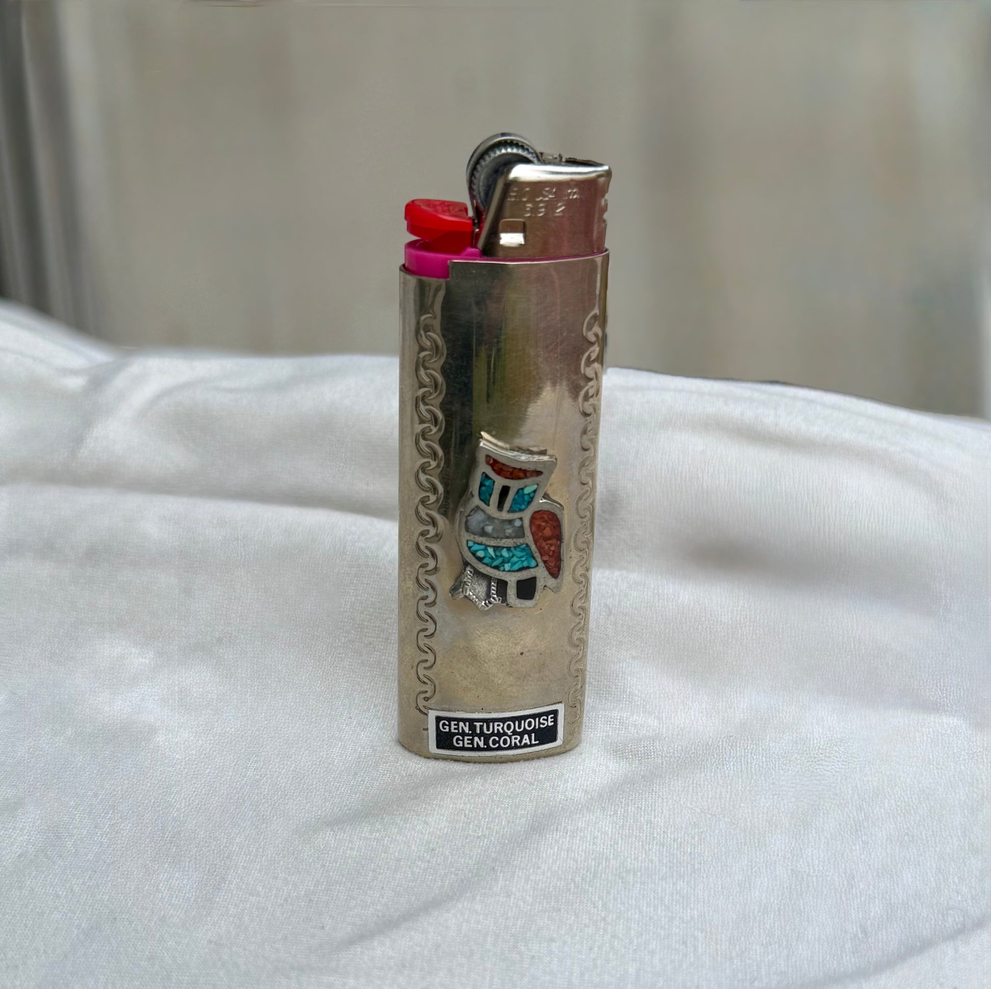 Spice up your Bic game with our Turquoise and Coral Bic Lighter Case! This unique case features a vintage owl design and is handcrafted with nickel silver, turquoise, and coral.