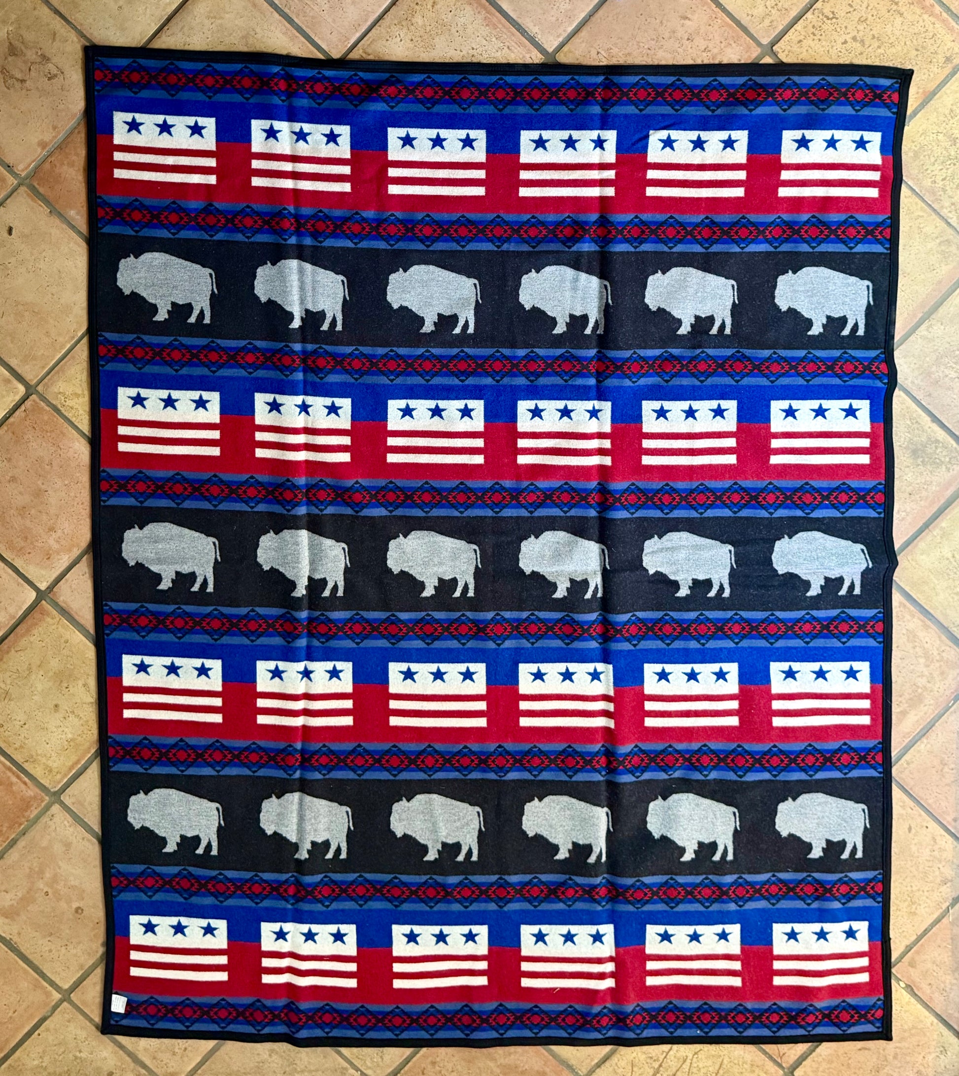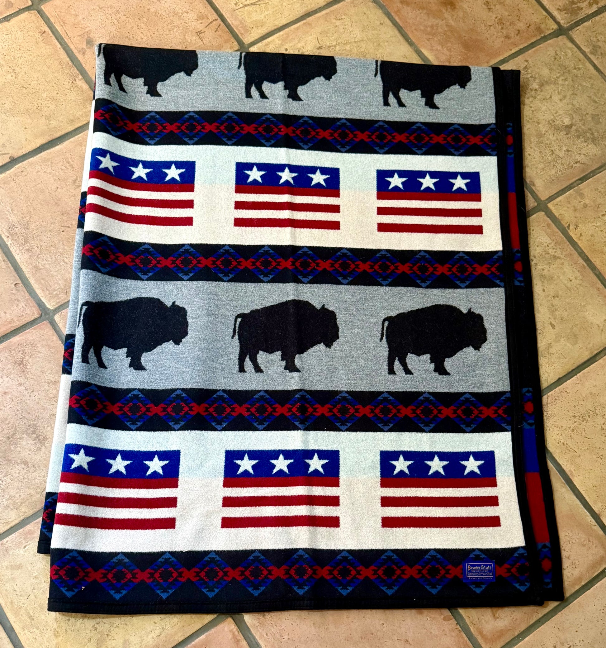 This vintage beaver state Pendleton blanket features a striking American Flag and Buffalo design. Measuring 64” x 81”, it adds a touch of Americana to any room. Made from high-quality materials, this blanket is both stylish and durable, making it a perfect addition to your home.