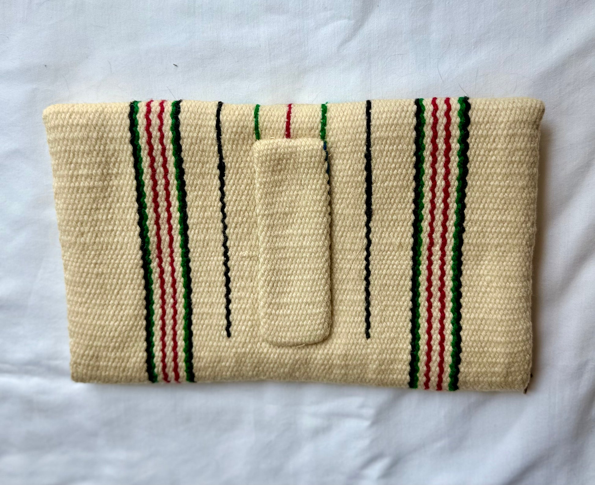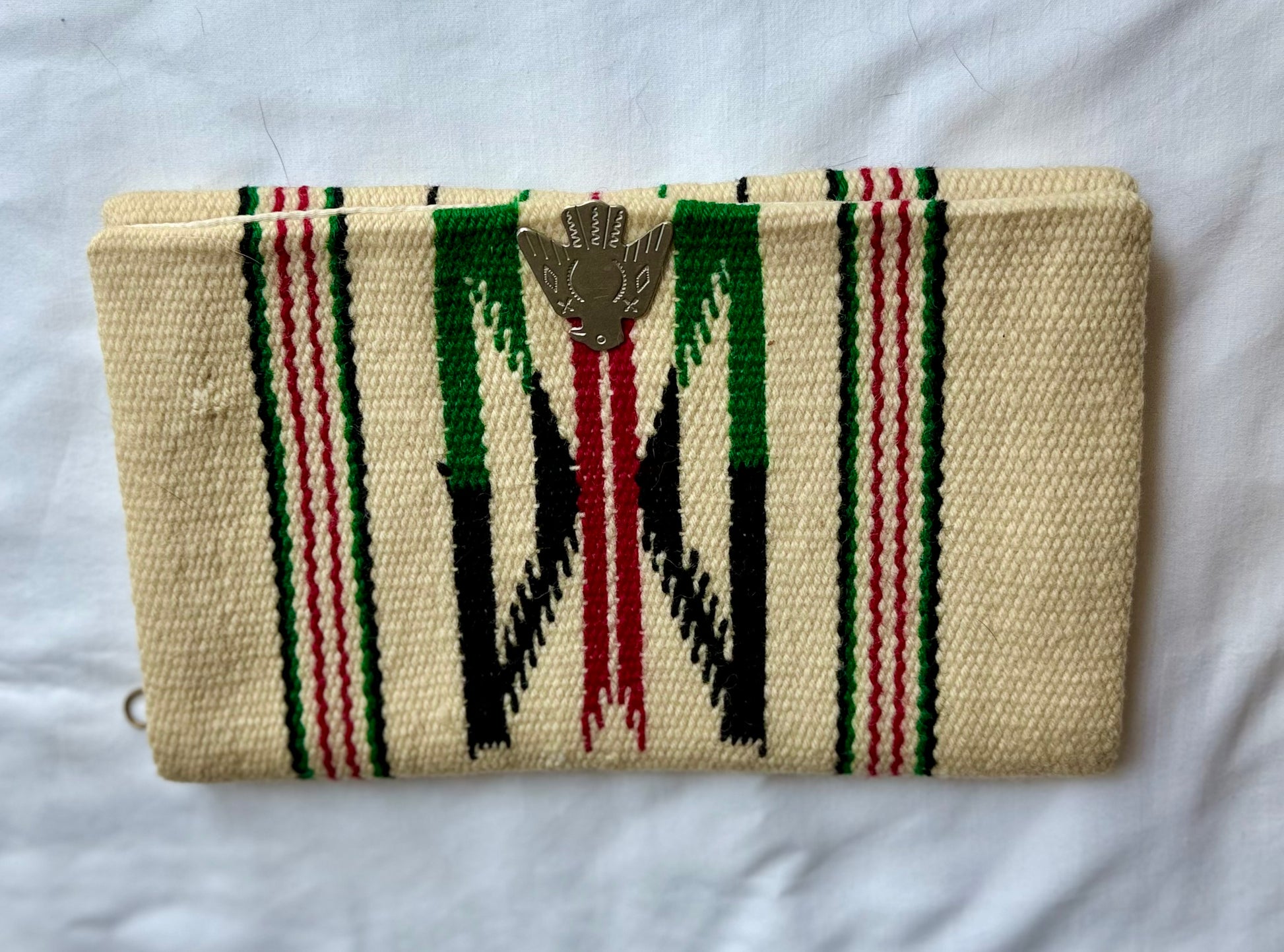 This striking vintage clutch is handwoven in a bold Southwestern design with vibrant green, red, and black patterns against a warm cream background. The centerpiece is a silver-tone Thunderbird accent, symbolizing strength and protection in Native traditions, adding both charm and character to the piece.