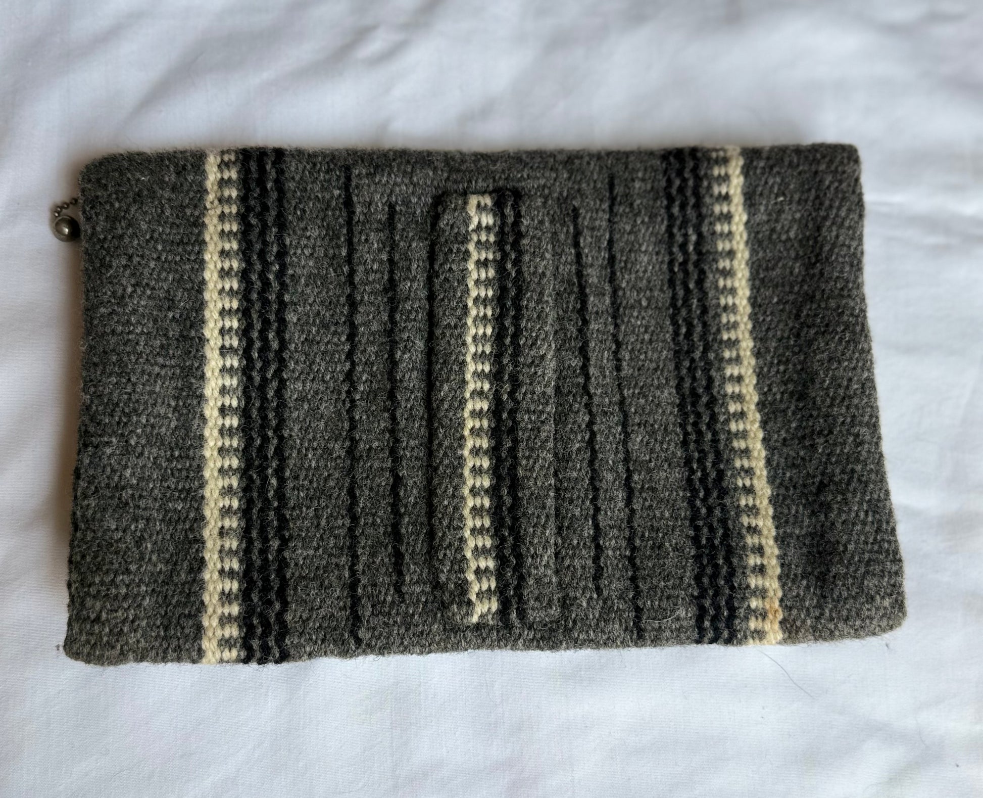 This vintage clutch features a textured gray wool weave accented with bold red, black, and cream geometric designs. At the center, a decorative silver-tone concho adds a distinctive Southwestern touch, balancing tradition with style. A versatile accessory with character, it reflects the artistry and craftsmanship of classic handwoven textiles.