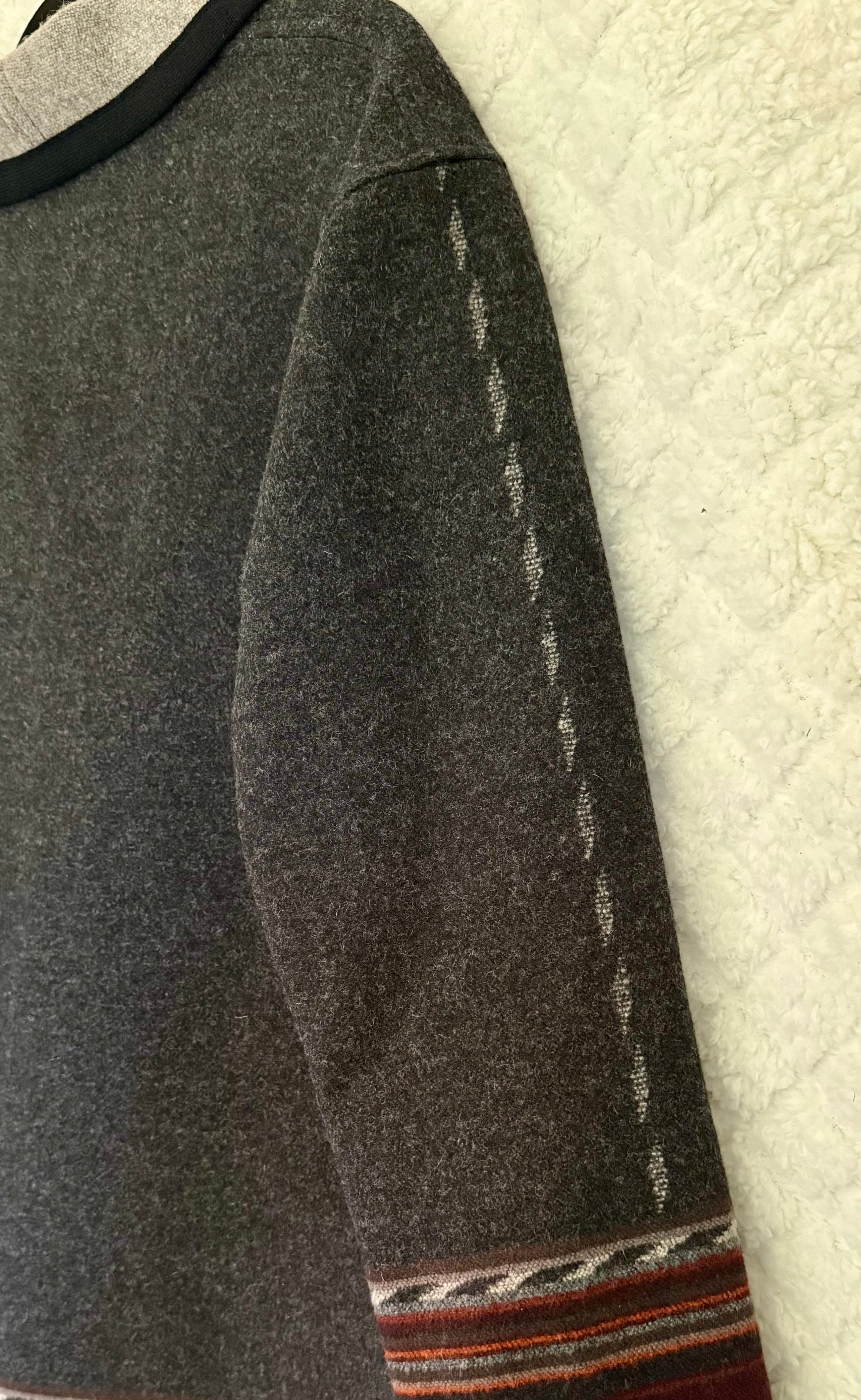 Stay cozy and stylish with our Vintage Pendleton Jacket. Made from dark gray wool, this jacket features eye-catching red, white, and orange detailing and a nice light gray design down each arm. Perfect for any occasion, it measures 31" in length and has a comfortable fit for a size medium.
