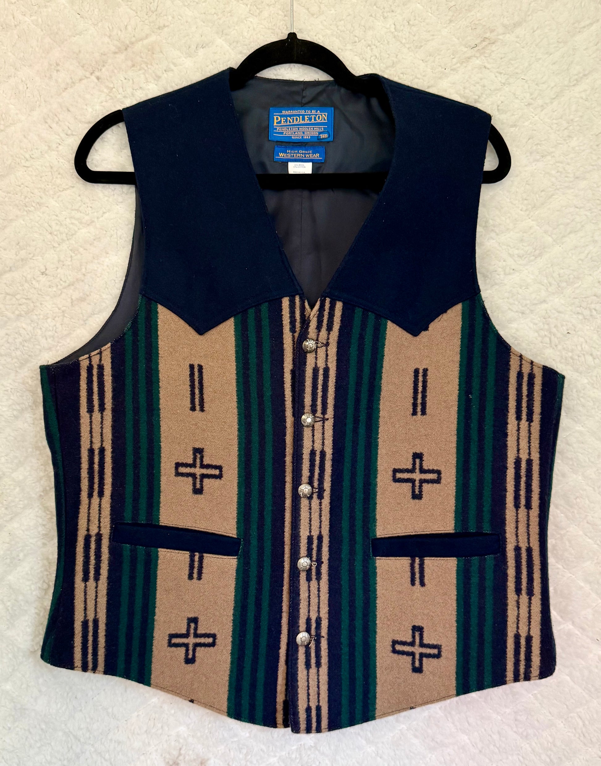 This vintage Pendleton vest is a high grade western wear that exudes classic style. With a size 40 and 23" length, it offers a perfect fit for any occasion. The shoulder measurement of 15" adds an extra layer of comfort and style. Elevate your wardrobe with this timeless piece.