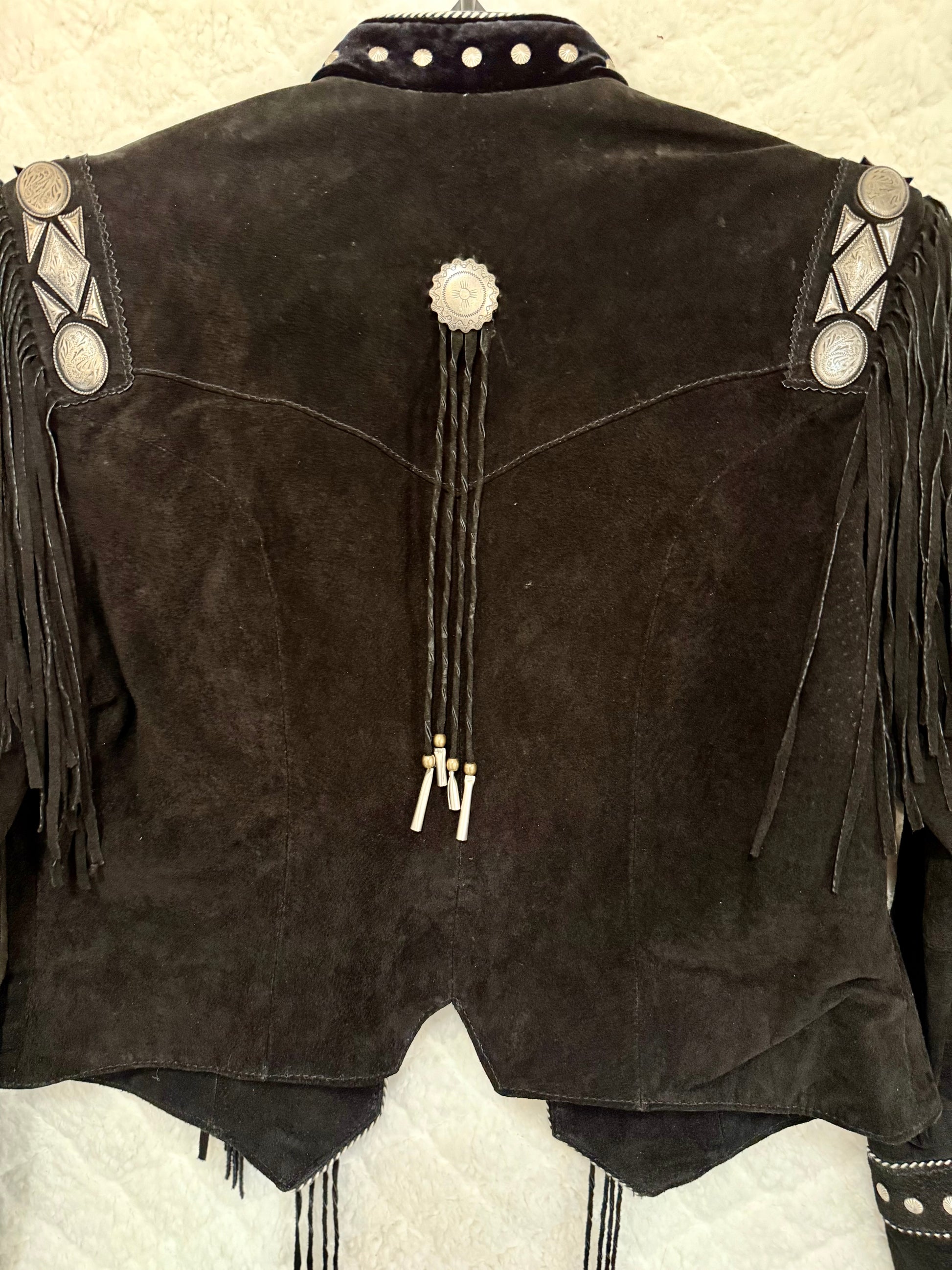 This vintage black leather jacket by Pioneer Wear exudes a timeless style with its beautiful silver details and flowing fringe. In size medium, it's the perfect addition to any wardrobe, providing both fashion and function.