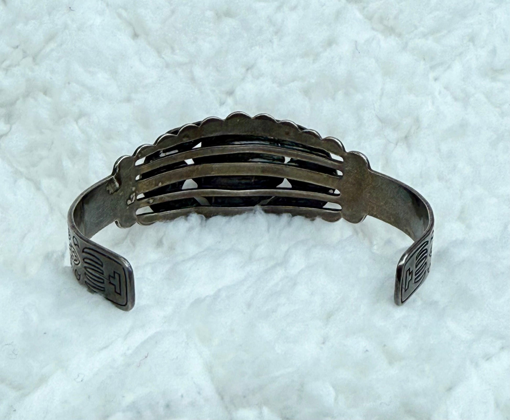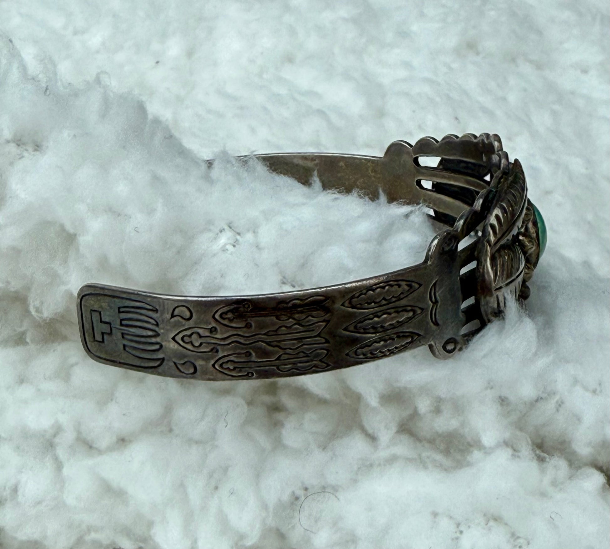 This vintage sterling silver cuff features a stunning turquoise stone and intricate silver detailing that highlights its timeless charm. Measuring 5 1/2" with a 1 1/4" gap, it offers a comfortable fit while adding a unique touch to any outfit.