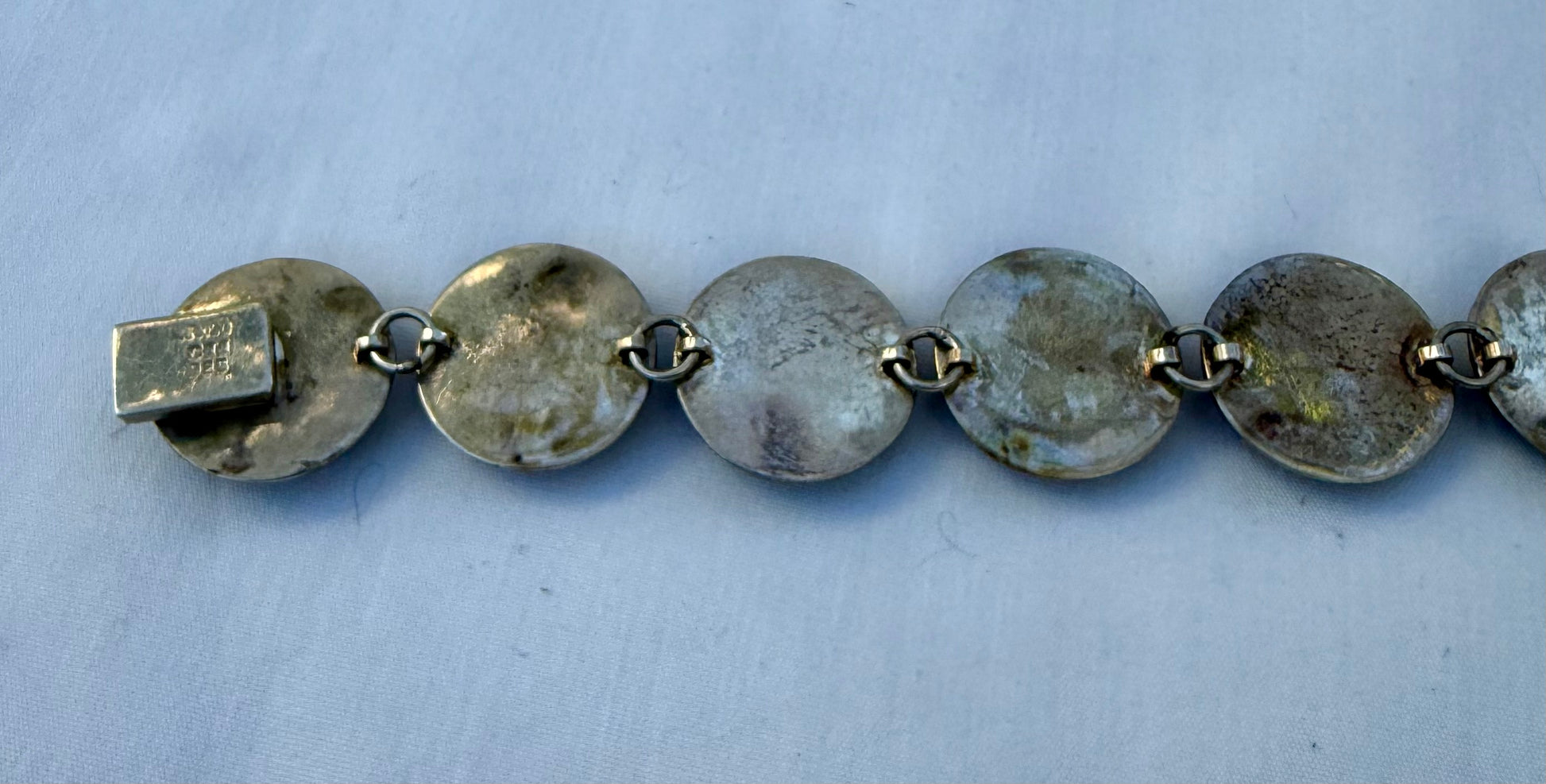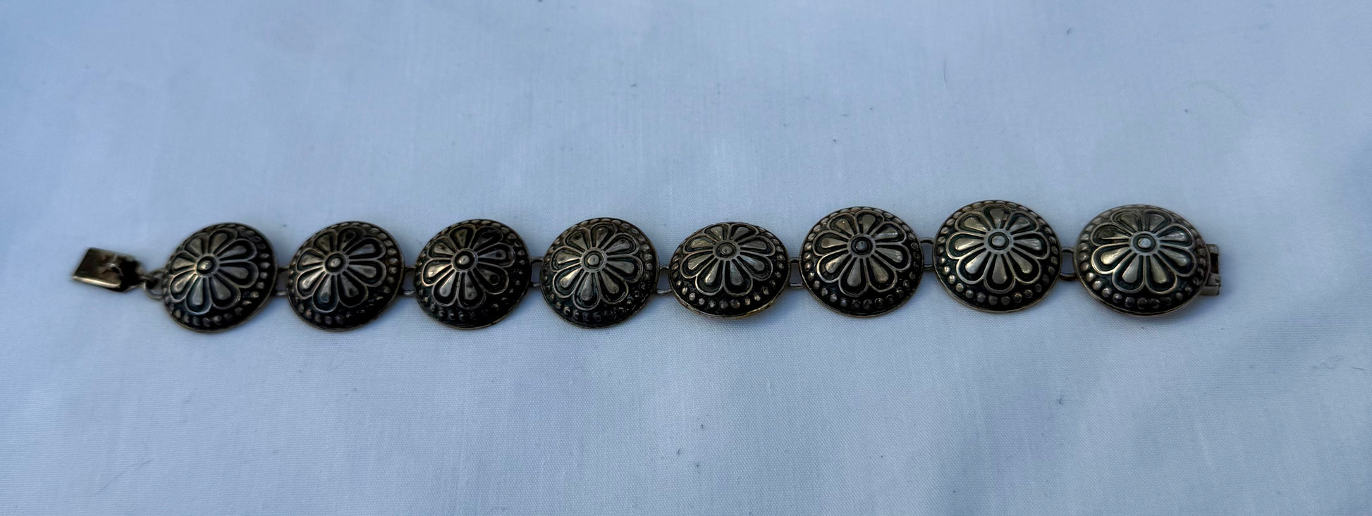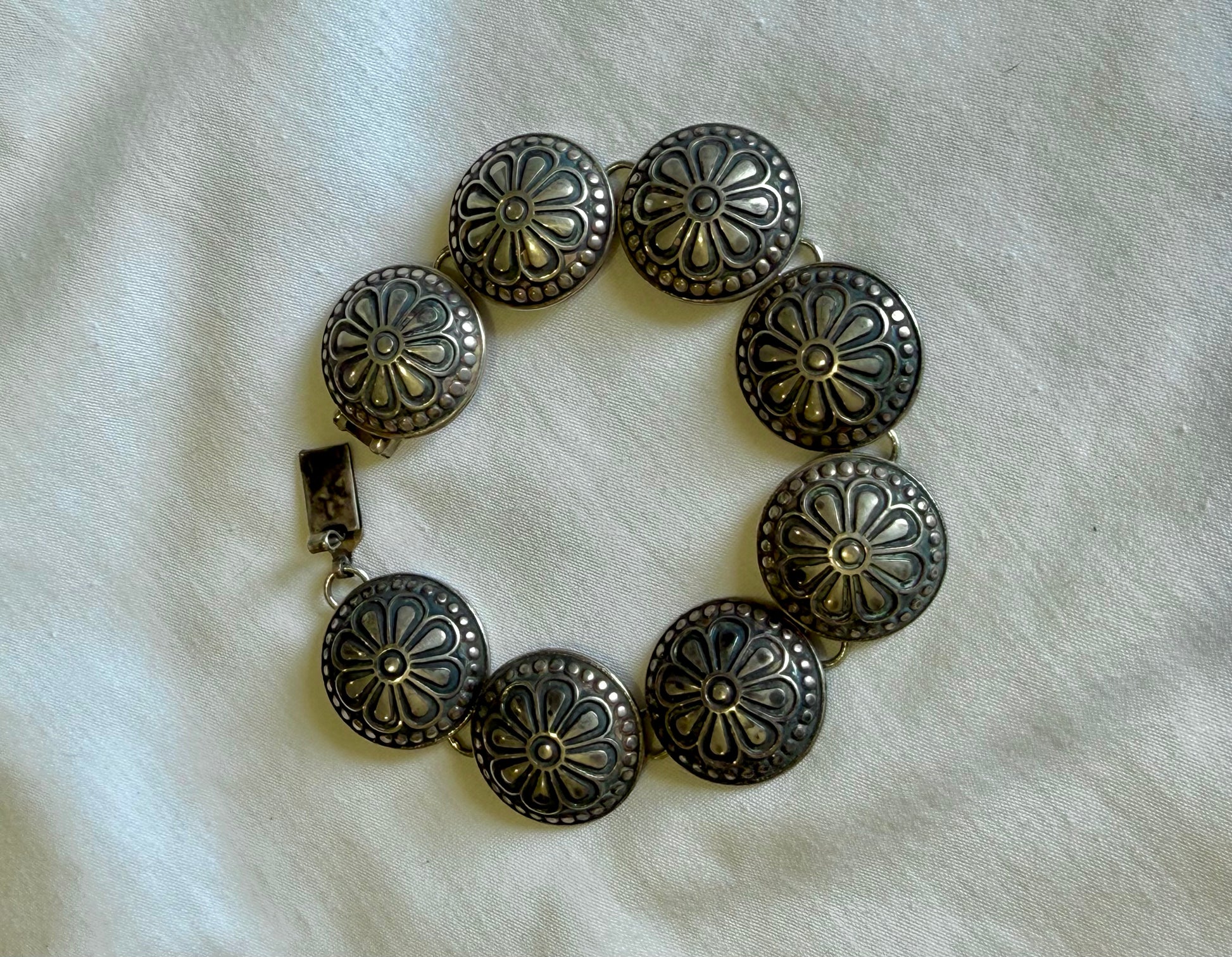 This Vintage Sterling Silver Concho Bracelet is a stunning piece of jewelry crafted in Mexico and signed CTT. Made of high-quality sterling silver, it boasts intricate Concho designs and measures 8 1/2 inches in length, making it a timeless addition to any collection.