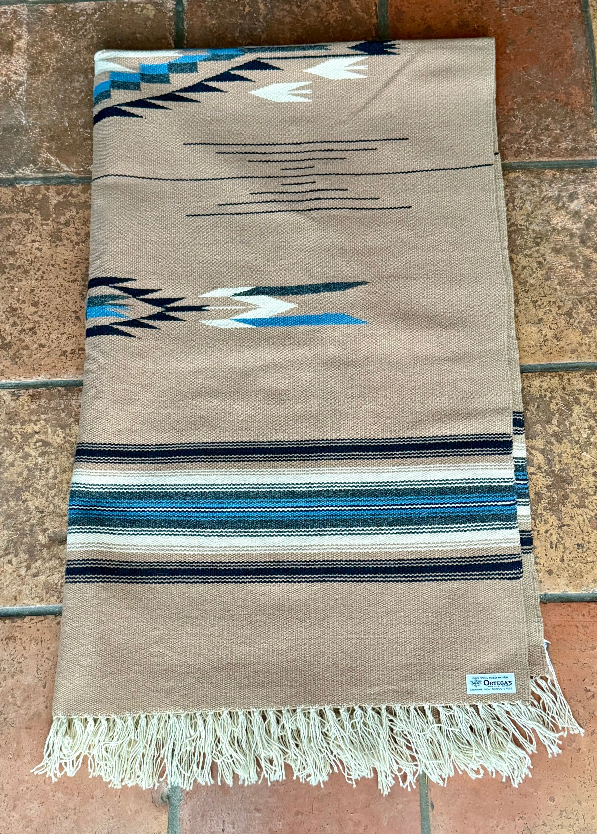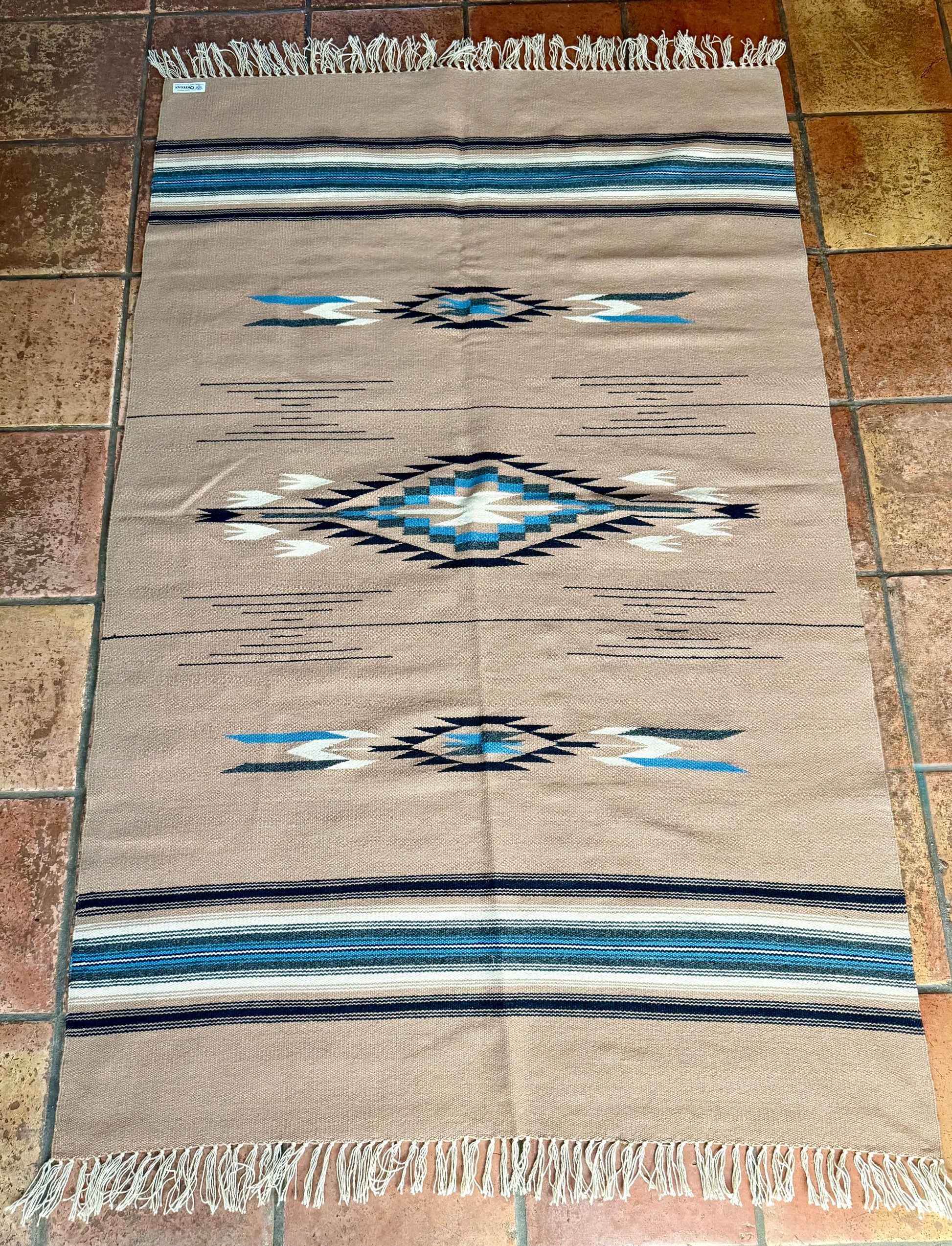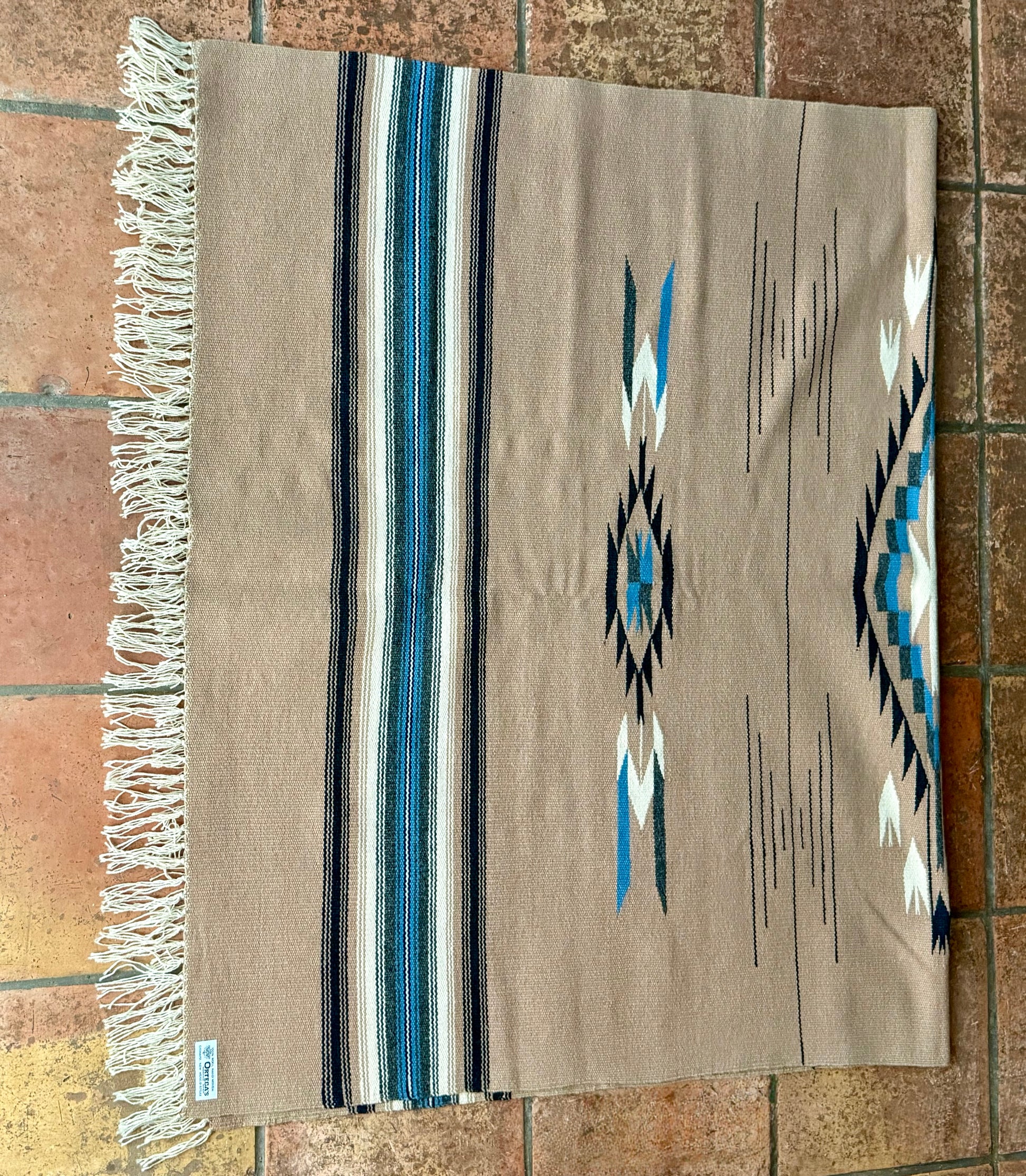 This vintage Chimayo blanket or rug measures approximately 46” x 72” and features a warm tan wool base accented with striking turquoise, navy, black, and ivory geometric patterns. The bold central diamond motif, paired with arrow-like accents and traditional striped borders, showcases the artistry of Chimayo weaving traditions.