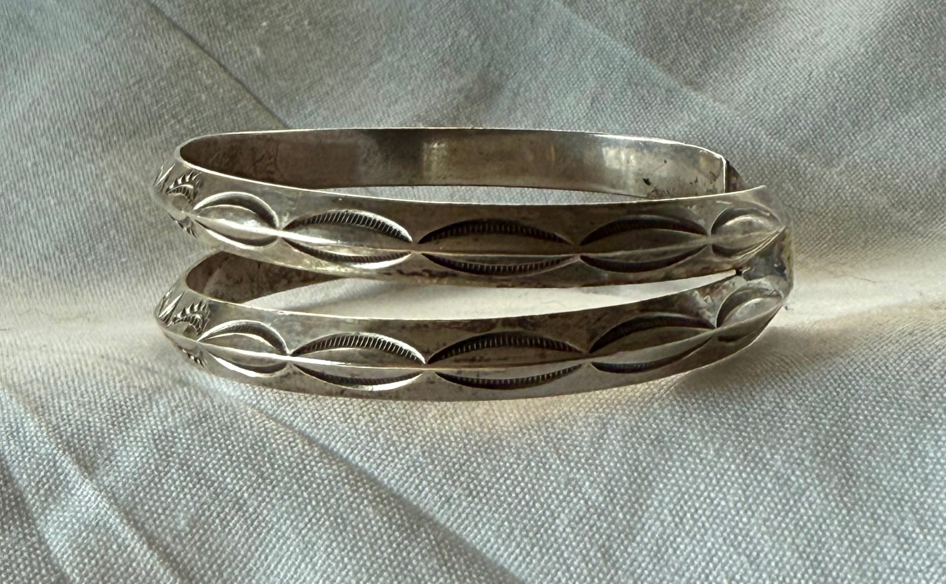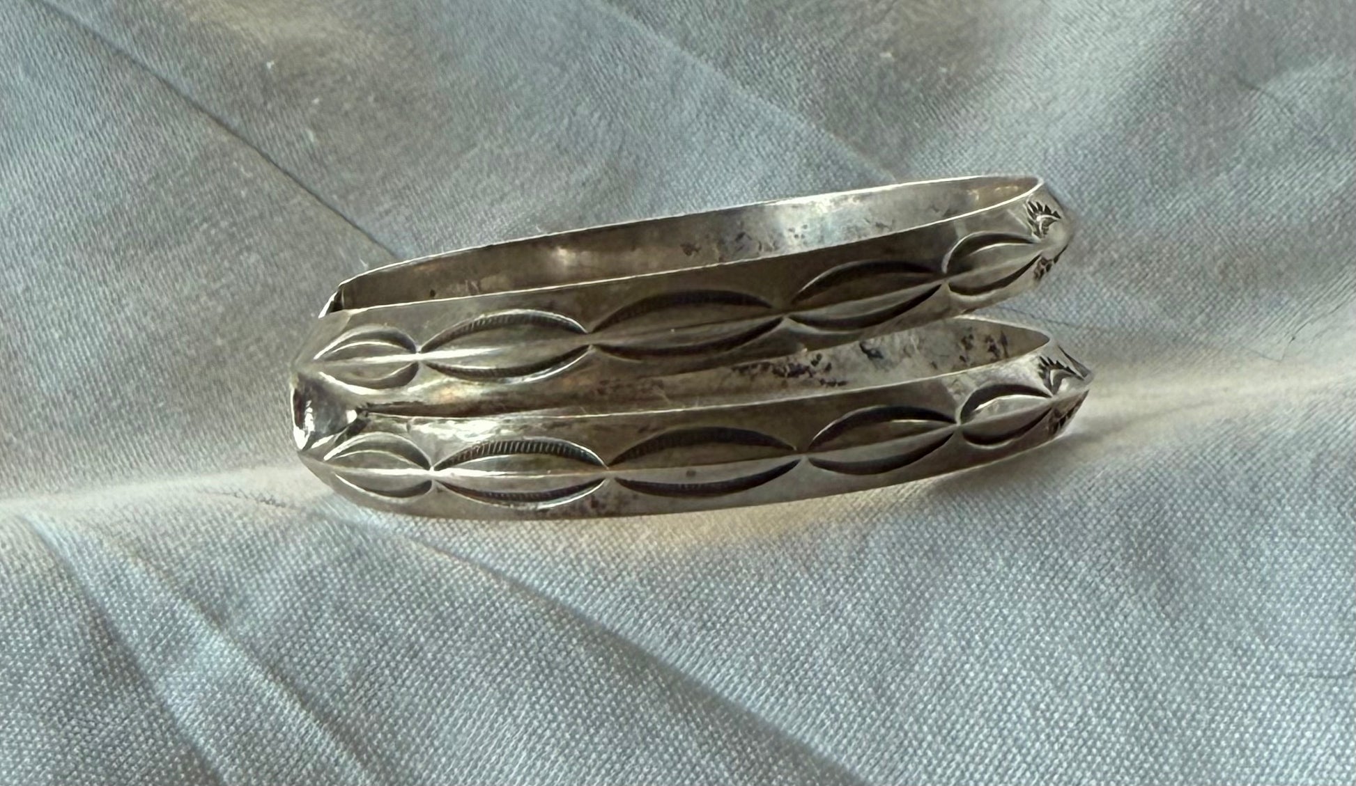 A vintage two-shank sterling cuff with clean lines and subtle Southwest detailing, reflecting timeless craftsmanship and classic style.